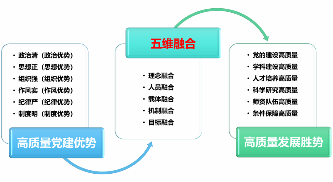 以“五维融合”机制为切入点,深入探索党建引领学院发展的理论逻辑与实践路径,将高质量党建产生的政治优势、思想优势、组织优势、作风优势、纪律优势、制度优势有效转化为学院高质量发展胜势。