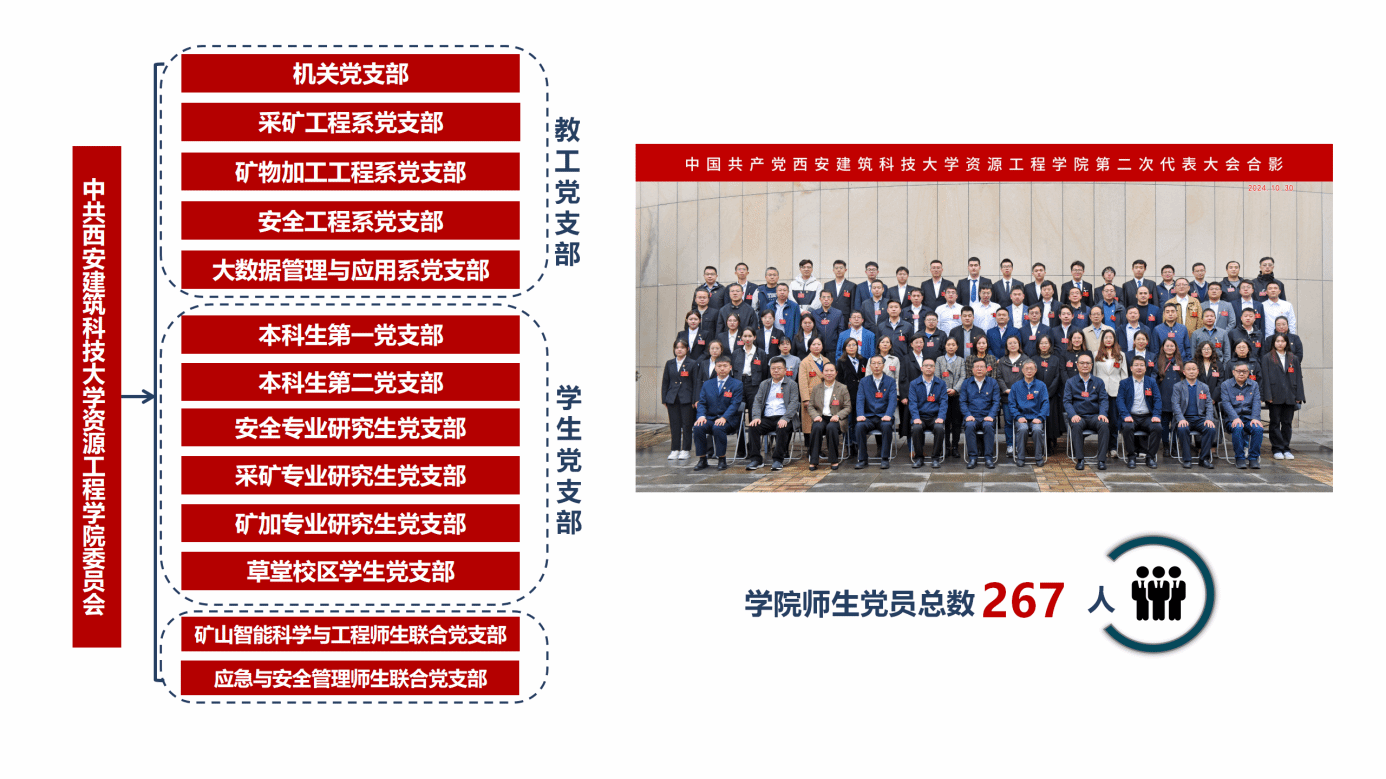 资源工程学院党委辖13个党支部,其中教工党支部5个,学生党支部6个,师生联合党支部2个,专任教师党支部书记高级职称占比100%,“双带头人”配备率100%。学院现有党员267人,其中教工党员76人,占比89%,学生党员191人,占比13.17%。学院党委于2024年成功召开第二次党代会,现任两委委员平均年龄42岁,组织机构健全,工作队伍齐整,运行情况良好。