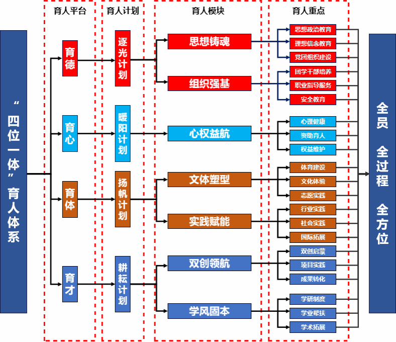 回归教育教学本质,构建“四位一体”育人体系,夯实“育德、育心、育体、育才”思政平台基础,搭建“思想铸魂、组织强基、双创领航、学风固本、心权益航、文体塑型、实践赋能”七大育人模块,形成“纵向贯通成长链、横向激活生态圈”的育人范式,为学院卓越人才培养奠定坚实基础。