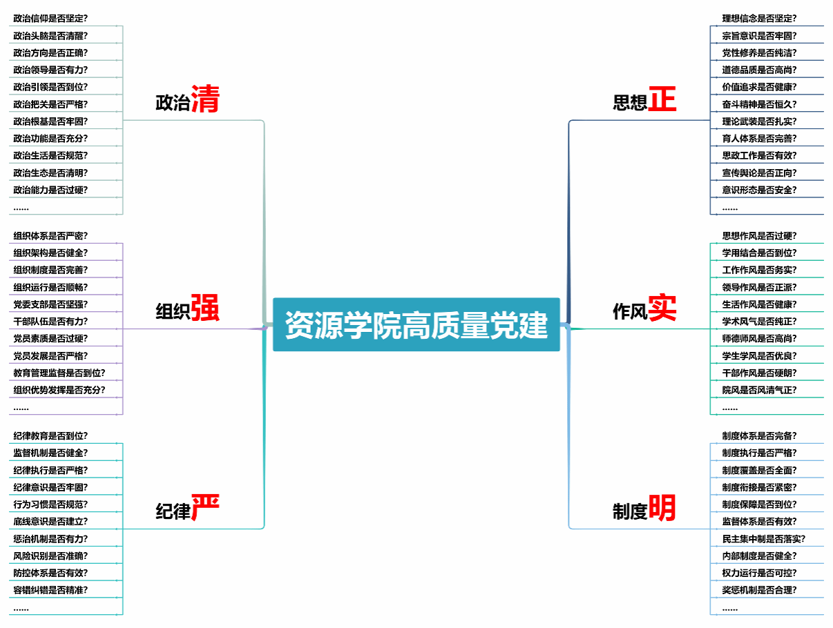 坚持科学、系统、规范原则,细化“4+12”党建工作体系,聚焦“什么是资源学院高质量党建”关键问题,从党的六大建设入手,以“政治清、思想正、组织强、作风实、纪律严、制度明”为出发点和落脚点,探索构建了资源学院高质量党建框架体系,开出党建“问题单”,明确“任务书”,制定“施工图”,为党建工作质量提升建立政策理论依据及实践探索基础。与此同时,通过推行学院领导班子“三张清单”、制定学院年度党建工作重点任务清单、构建党建制度体系等举措,逐级夯实责任,逐项抓好落实,持续提升党建工作科学化、系统化、规范化、实效化水平。